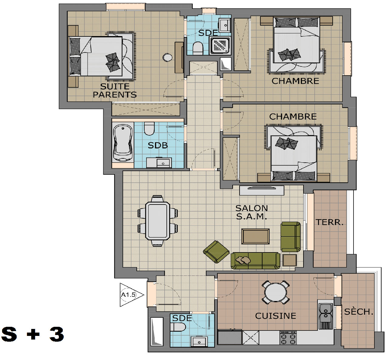 - L'appartement AX5 de la résidence Zeineb, synonyme de standing élevé, présente un espace de vie raffiné de type S+3, situé au premier, deuxième et quatrième étage. Avec une généreuse surface de 149.92 m², cet appartement incarne l'harmonie parfaite entre le luxe et la fonctionnalité.
